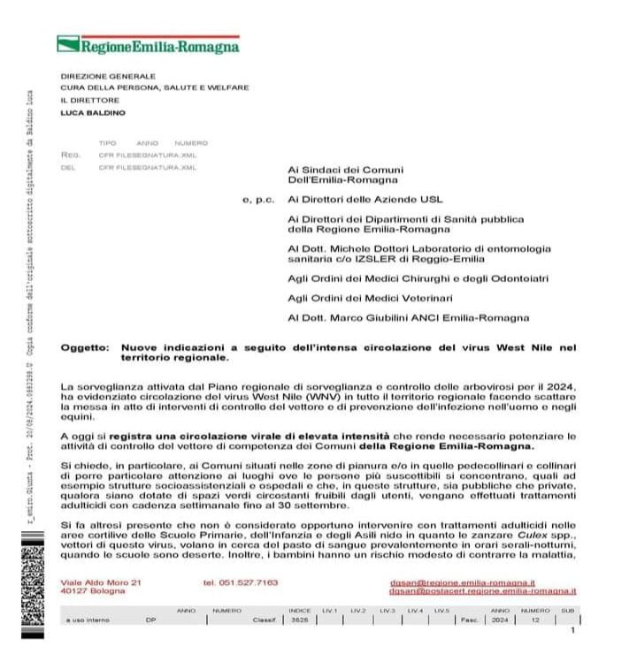 “Siamo tutti chiamati- commenta l’assessore alle Politiche per la salute, Raffaele Donini- ad intensificare il livello di prevenzione riguardo al virus West Nile. In queste settimane, come ogni anno, con Comuni e Aziende sanitarie siamo al lavoro per prevenire e contrastare malattie virali potenzialmente gravi che le zanzare possono trasmettere. La sorveglianza attivata dal Piano regionale di sorveglianza e controllo delle arbovirosi per il 2024 ha evidenziato la circolazione del virus West Nile in tutto il territorio regionale facendo scattare la messa in atto di interventi di controllo del vettore e di prevenzione dell’infezione. Negli ultimi giorni si è osservata però una maggiore concentrazione di casi nei territori di pianura di Bologna, Reggio Emilia e Modena; da qui la necessità di alzare il livello di prevenzione”.