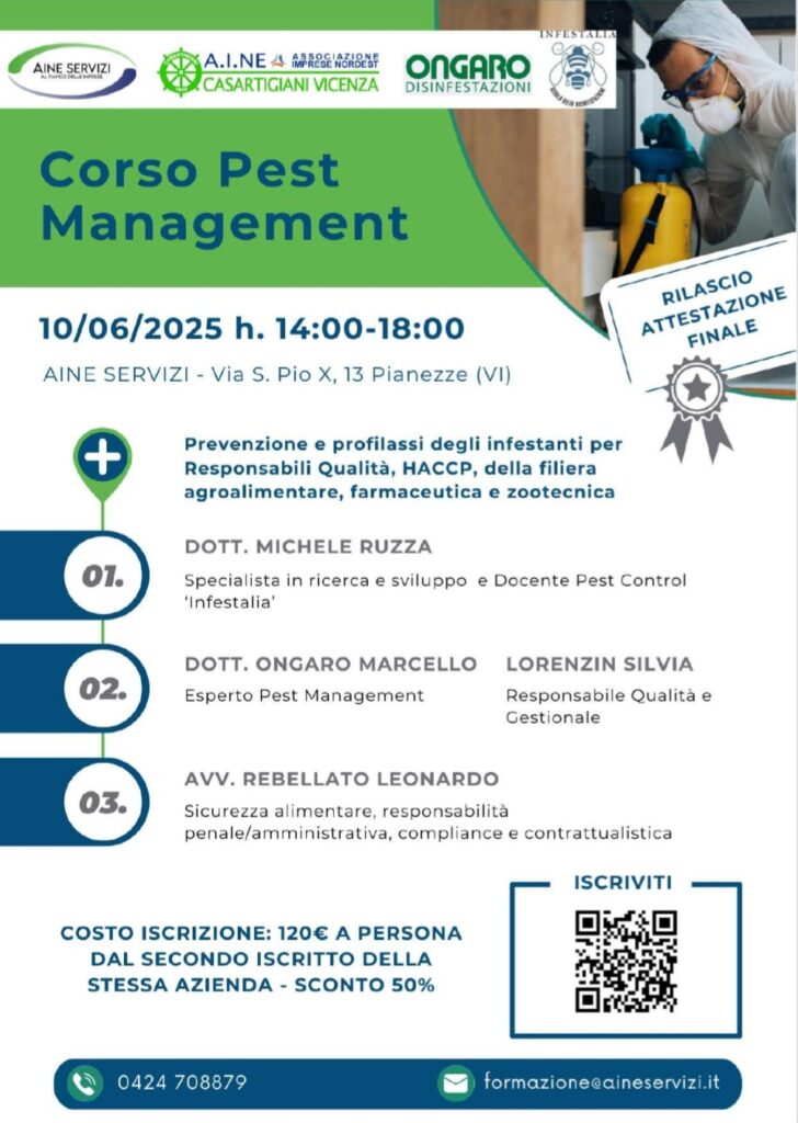 1406* 12 dicembre 2025 L’evoluzione della maggior parte delle norme e gli standard volontari (BRCGS Food, IFS Food, ecc.) operativi nelle Imprese della filiera alimentare chiede la necessità di un acculturamento dell’utenza interna nell’effettuare ispezioni, nel riconoscimento degli infestanti, nel tenere l’appropriato approccio alla prevenzione delle infestazioni… Il Corso di Formazione, organizzato da Ongaro Disinfestazioni […]