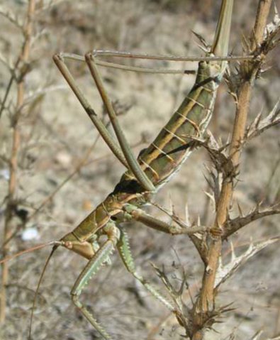 Questa cavalletta è zoofaga: caccia altri insetti come locuste usando zampe spinose simili a quelle delle mantidi, mimetizzandosi grazie al colore verde.