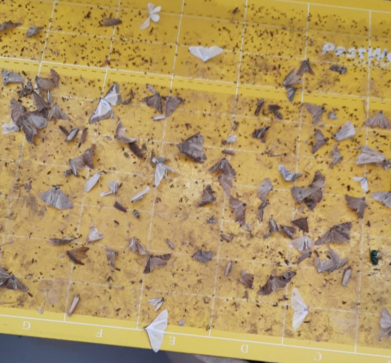 Nel caso della foto, l’immagine evidenzia come una piastra collante di un elettro insetticida installato per il controllo di insetti volanti presso un’azienda, abbia sulla  propria superficie “catturato” alcuni lepidotteri, un ampio ordine di insetti anche notturni di cui fanno parte farfalle e falene.