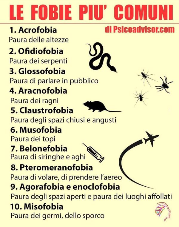 Ofidiofobia (paura dei serpenti), aracnofobia (paura dei ragni), musofobia (paura dei topi) e misofobia (paura dei germi e dello sporco) per alcuni studi risultano essere tra le fobie più comuni tra le persone. Certo che ciò dipende molto dallo stato sociale, dalle condizioni di vita in cui si trova il soggetto, dalla cultura e da soggettive sensibilità, dovute  magari da qualche trauma avuto nel passato.