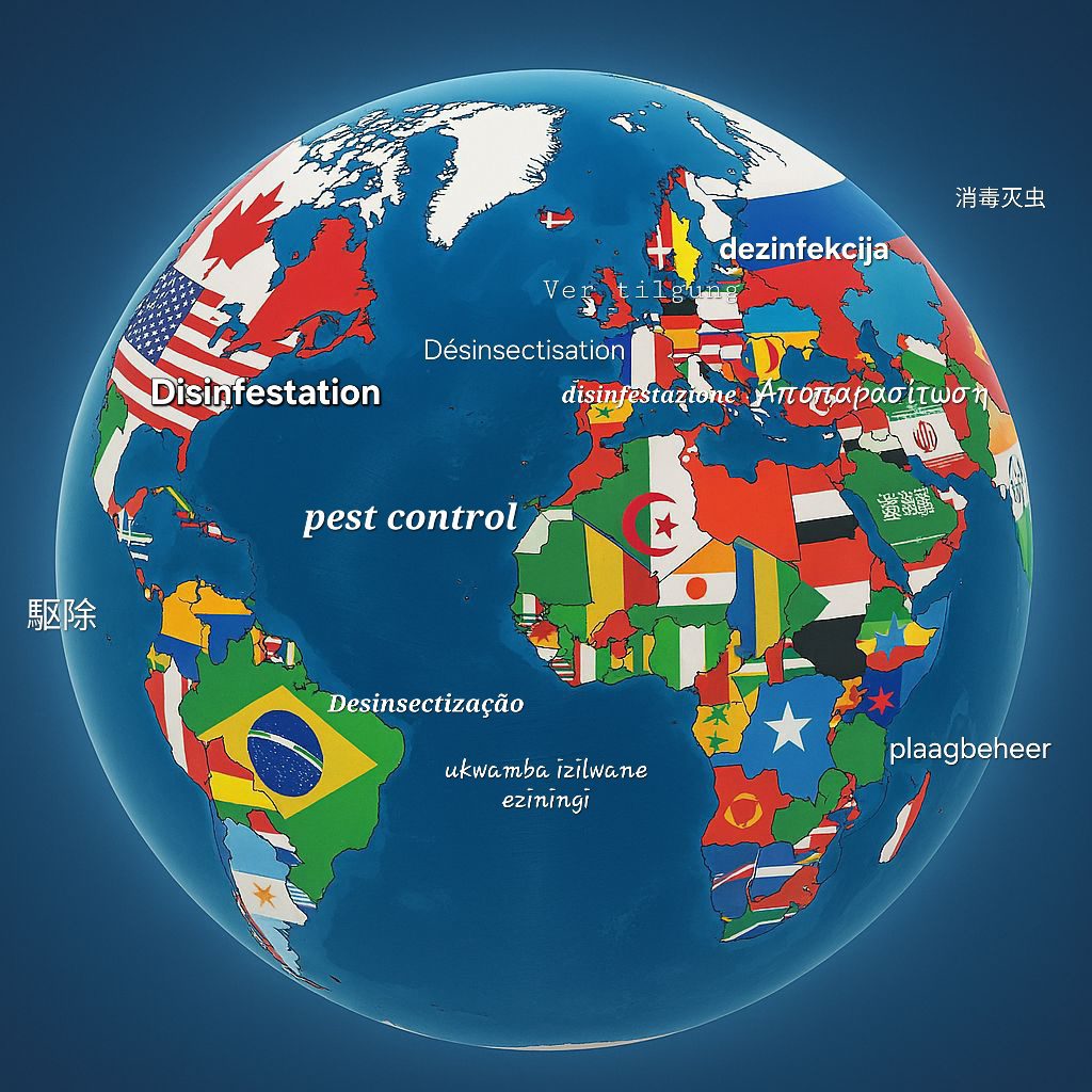 Russo: дезинсекция (dezinsektsiya) per la disinsettazione o дератизация (deratizatsiya) per i roditori, con дизинфекция (dizinfektsiya) per contesti più ampi di disinfestazione